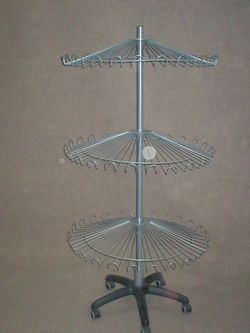 Stojak podłogowy z trzema karuzelami do ekspozycji obuwia, na nodze plastikowej z kółkami.