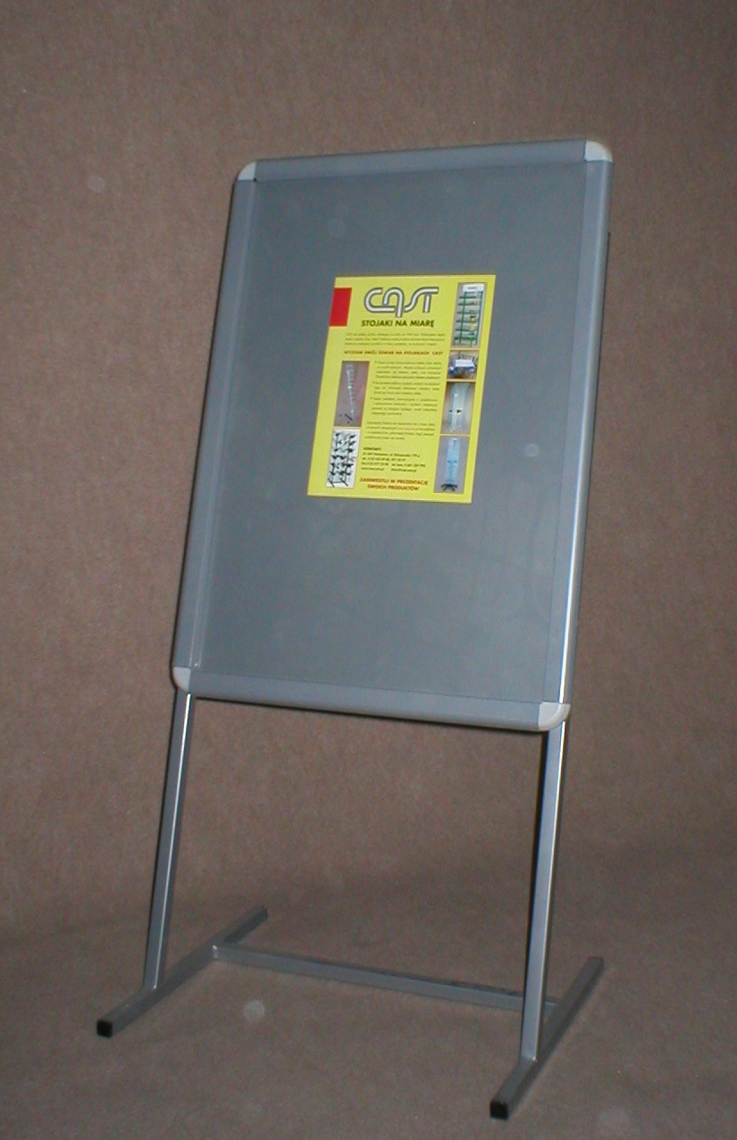 Aluminiowa ramka zaciskowa z antyrefleksyjną folią ochronną odporną na promieniowanie UV, tylna scianka z tworzywa, noga stalowa.