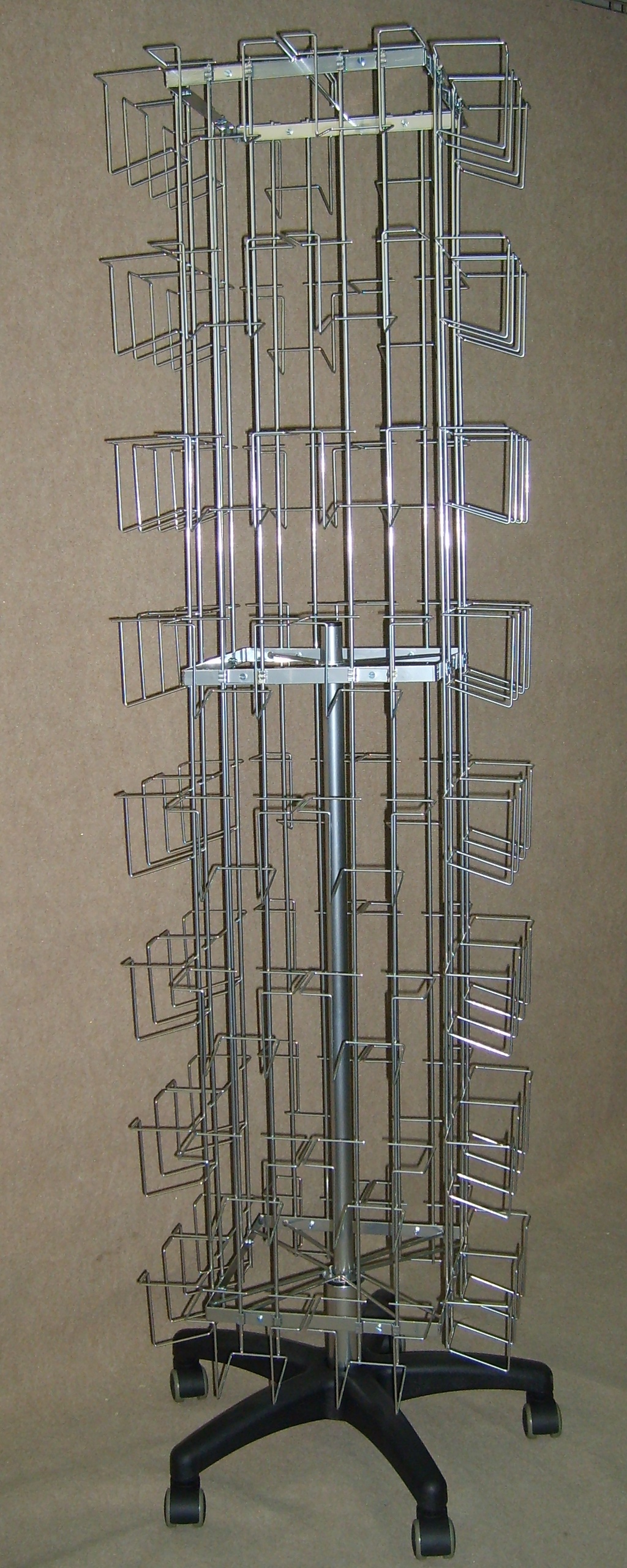 Stojak podłogowy, obrotowy, na plastikowej nodze na kółkach, przeznaczony do ekspozycji płyt CD i DVD.