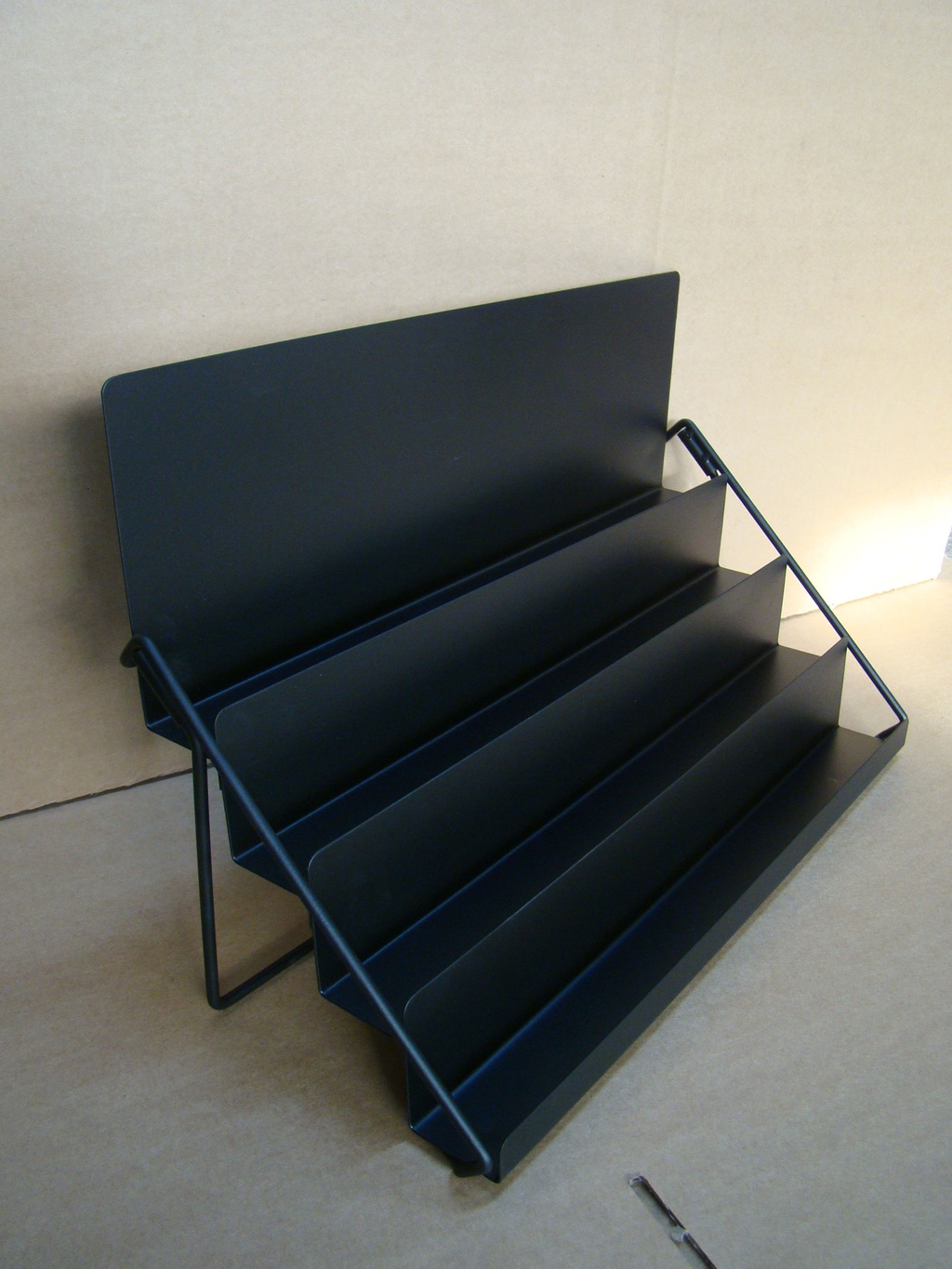 Stojak na zdjęciu ma 4 przegrody 380*40mm każda, kolejne poziomy są ustawione co 60mm. Z tyłu najwyższej półki podwyższone plecy - miejsce na naklejkę z logo.